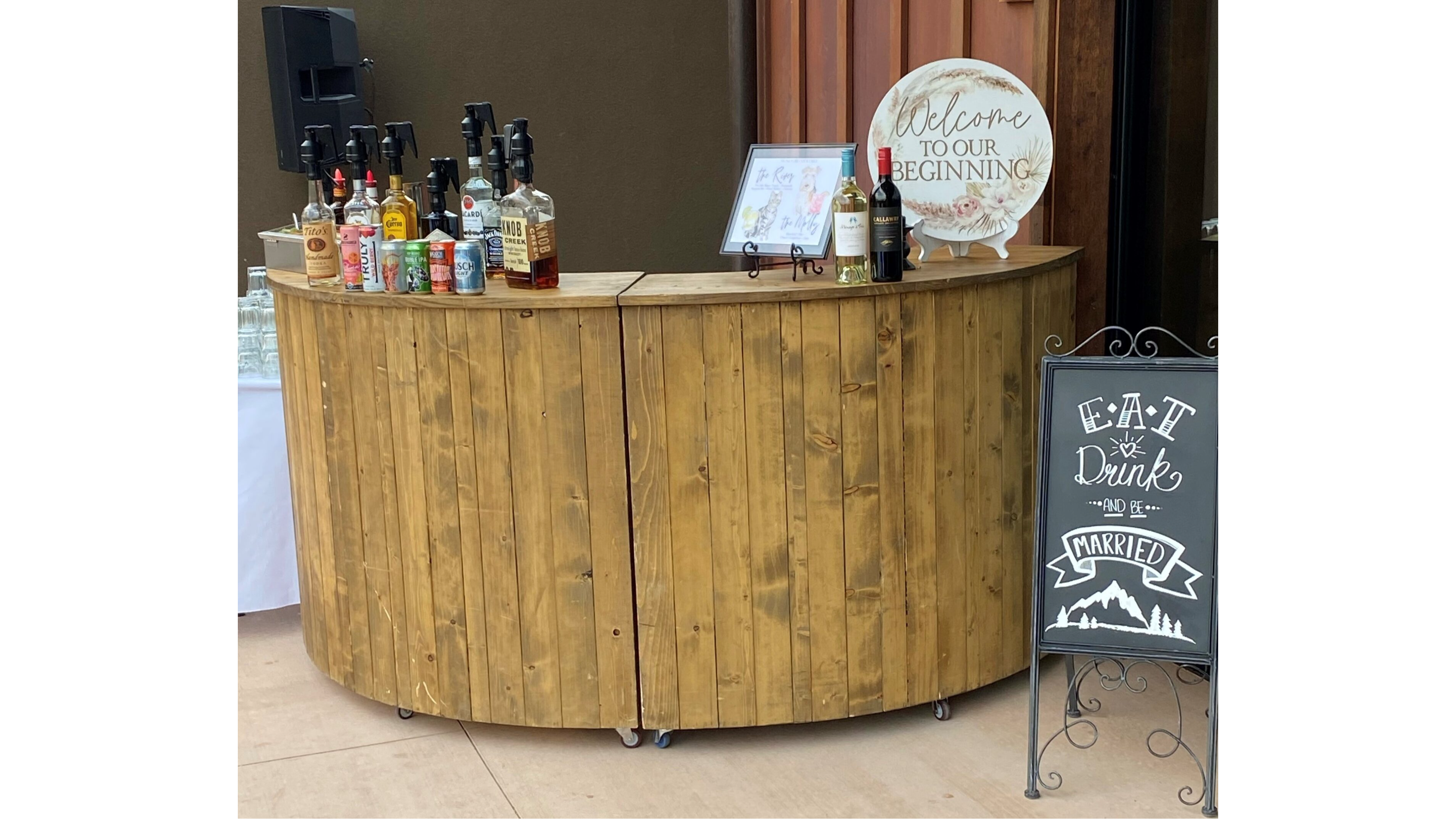 Wood Horseshoe Bar 87in Wide, 19.5in Long, 43.5 in Tall
